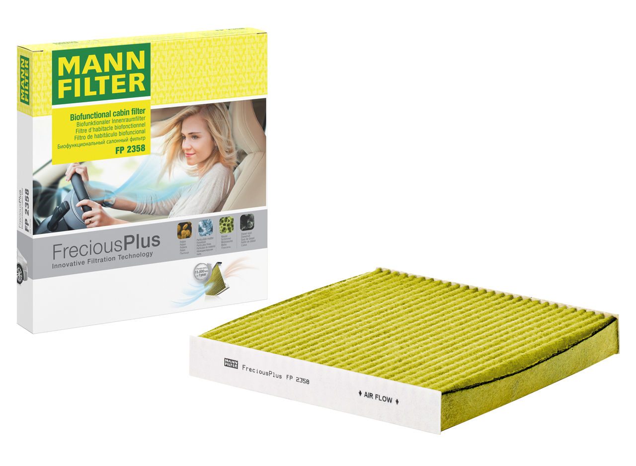 Biofunctional MANN-FILTER FreciousPlus cabin air filters - nearly 100% protection against nitrogen oxides, dust, allergens and mould - harmful gases and unpleasant odours are also eliminated and virus aerosols filtered. The three-layer filter technology absorbs almost 100% of allergens, reduces the growth of molds and bacteria by more than 98% and stops fine dust almost completely.Specification