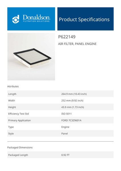 Genuine Donaldson P622149 Air Filter, Panel Engine is designed to provide reliable performance in air filter, panel engine applications. Built with high-quality materials, it ensures consistent functionality and durability.